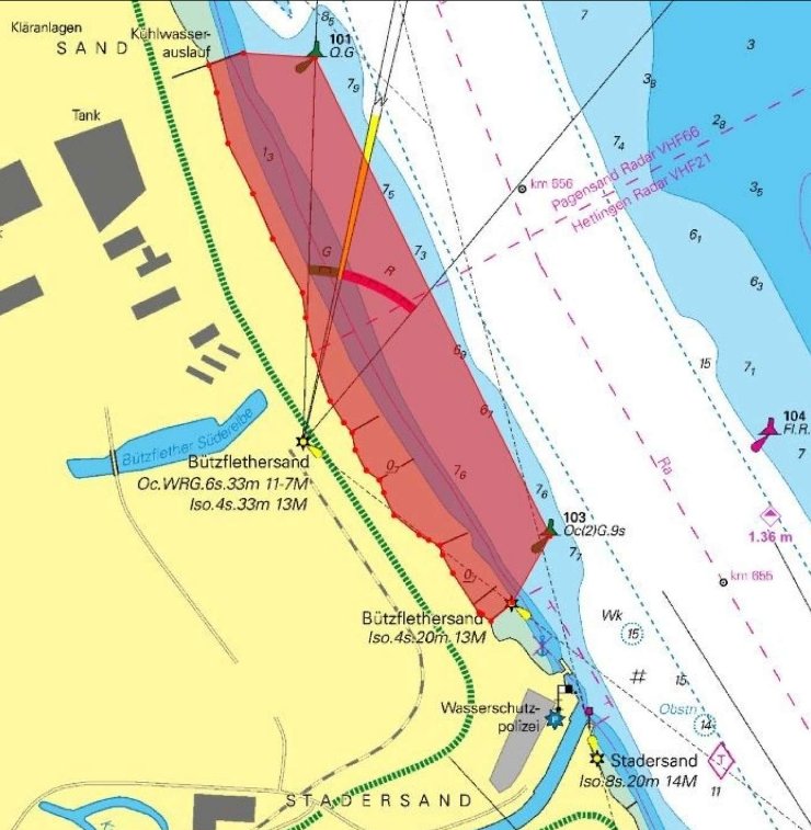 In Bützfleth haben die Arbeiten für den Bau eines LNG-Terminals begonnen. Für die Bauarbeiten wurde ein Sperrgebiet zwischen den Tonnen 101 und 103 und dem Ufer eingerichtet, das ebenfalls nicht befahren werden darf.