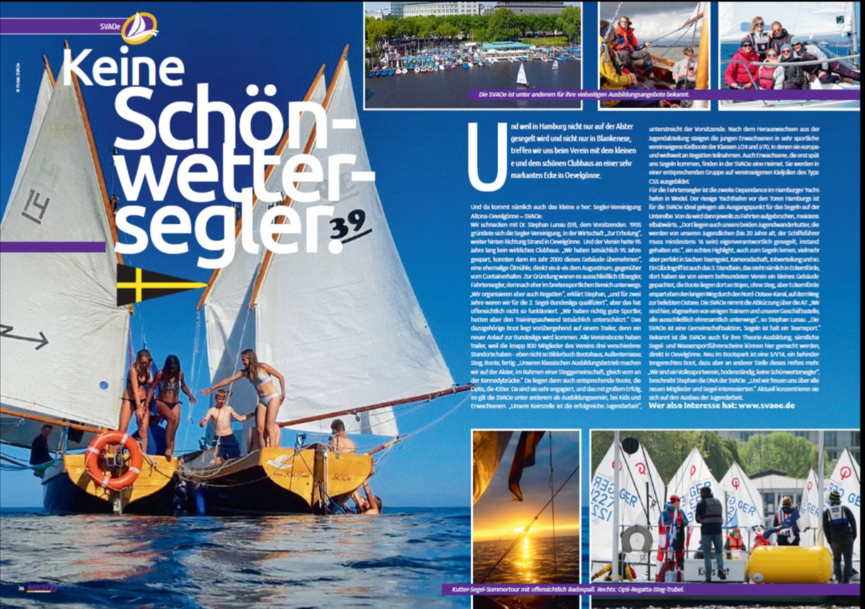 „Wir organisieren aber auch Regatten“, erklärt Stephan, „und für zwei Jahre waren wir für die 2. Segel-Bundesliga qualifiziert“, aber das hat offensichtlich nicht so funktioniert. „Wir haben richtig gute Sportler, hatten aber den Trainingsaufwand tatsächlich unterschätzt.“ Das dazugehörige Boot liegt vorübergehend auf einem Trailer, denn ein neuer Anlauf zur Bundesliga wird kommen. Alle Vereinsboote haben Trailer, weil die knapp 800 Mitglieder des Vereins drei verschiedene Standorte haben – eben nicht so Bilderbuch Bootshaus, Außenterrasse, Steg, Boote, fertig. „Unseren klassischen Ausbildungsbetrieb machen wir auf der Alster, im Rahmen einer Steggemeinschaft, gleich vorn an der Kennedybrücke.“ Da liegen dann auch entsprechende Boote, die Optis, die 420er. Da sind sie sehr engagiert, und das mit großem Erfolg, so gilt die SVAOe unter anderem als Ausbildungsverein, bei Kids und Erwachsenen. „Unsere Keimzelle ist die erfolgreiche Jugendarbeit“, unterstreicht der Vorsitzende. Nach dem Herauswachsen aus der Jugendabteilung steigen die jungen Erwachsenen in sehr sportliche vereinseigene Kielboote der Klassen J/24 und J/70, in denen sie europa und weltweit an Regatten teilnahmen. Auch Erwachsene, die erst spät ans Segeln kommen, finden in der SVAOe eine Heimat. Sie werden in einer entsprechenden Gruppe auf vereinseigenen Kieljollen des Typs C55 ausgebildet.