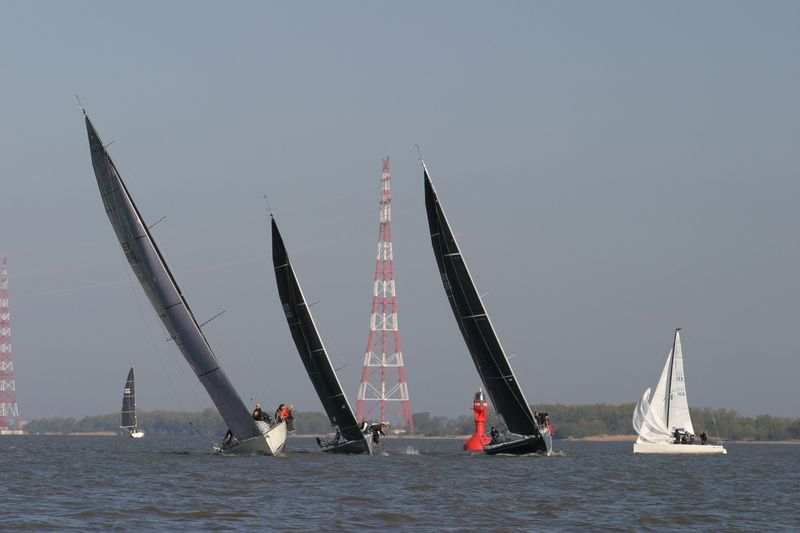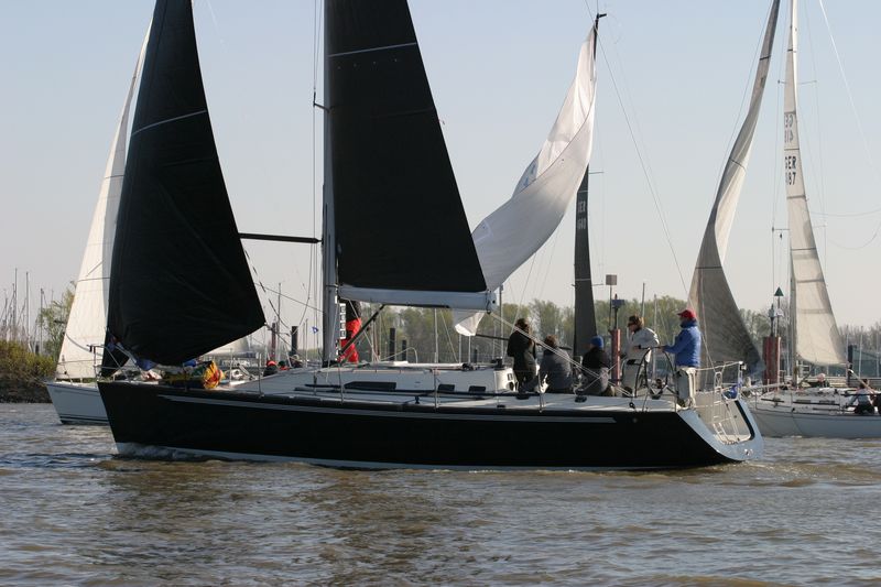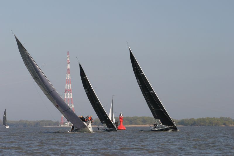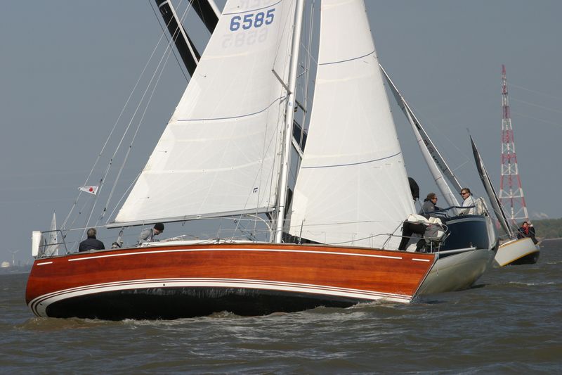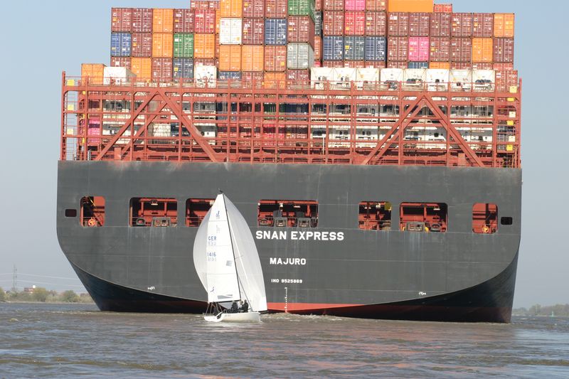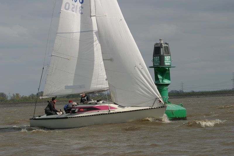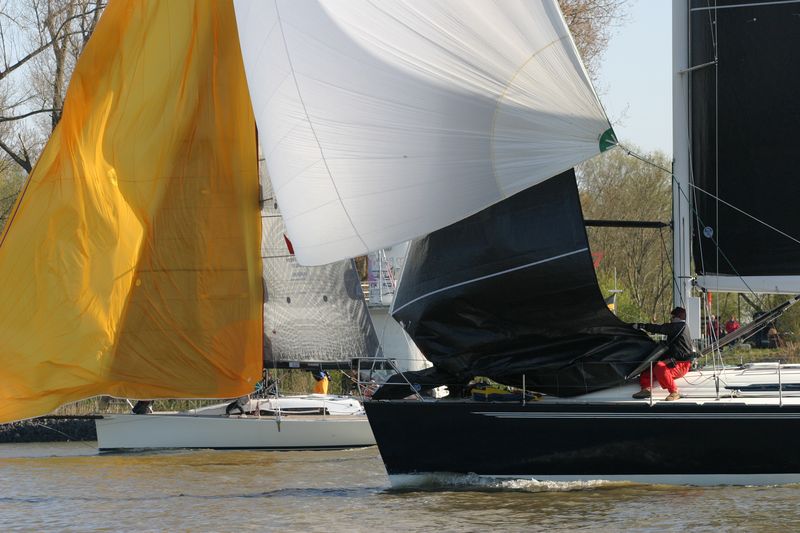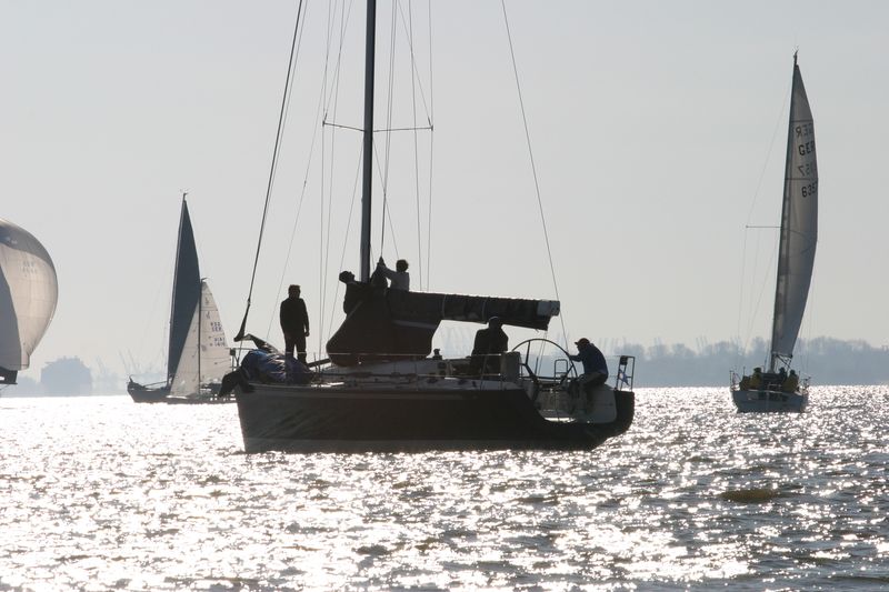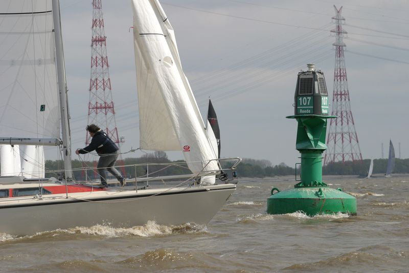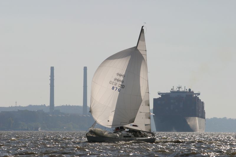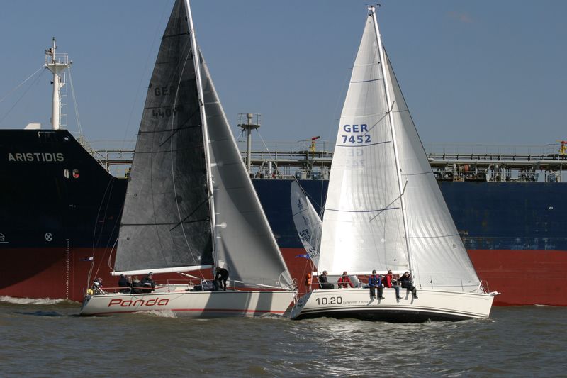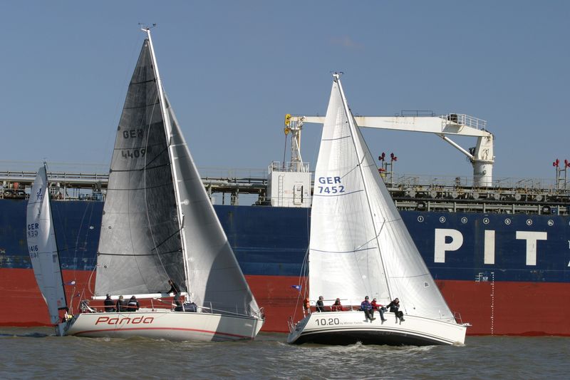 Den Start dirigierte Gesche Boehlich zuverlässig und genau; die Signale dazu gab Lui am Typhon. Der erste Start erfolgte in zwei Gruppen um 9 Uhr. Die Boote fuhren unter Spinnaker Richtung Stade und kehrten unter Kreuzen zurück. Ein wenig Dramatik brachte der Hapag-Lloyd-Containerfrachter „Ain Snan Express“ (386 m lang und 48 m breit) in das Geschehen. Dreimal tutete der Riese lang-kurz, während er auf das Regattafeld zuhielt, das sich gerade in der Fahrrinne oder dicht dabei befand. Lui als Wettfahrleiter versuchte, die Brücke von „Ain Snan Express“ zu erreichen, doch die blieb stumm. Das Aufeinandertreffen verlief dann aber recht entspannt; der Frachter hielt seinen Kurs stabil und versuchte nicht weiter, die Segler nervös zu machen, und die Segler enthielten sich der Verlockung, diesen Kurs knapp vor dem Bug des Frachters zu kreuzen. Später wurde die Ziellinie als Erstes von „Toni Express“ überquert, gefolgt von „Planlos“ und „Swift“ – was angesichts unterschiedlicher Startzeiten und Yardstickzahlen natürlich noch nichts über die Sieger aussagte.
