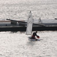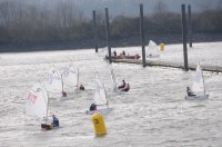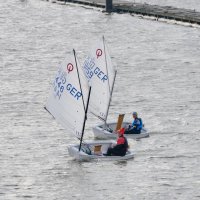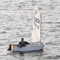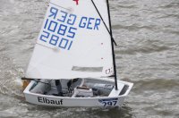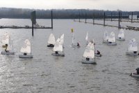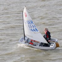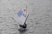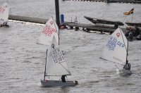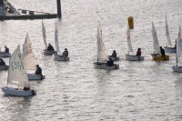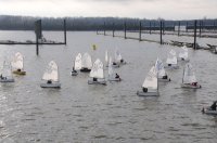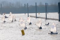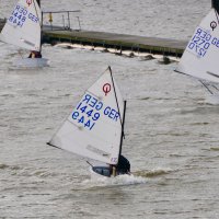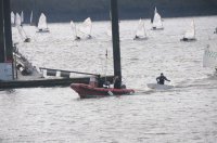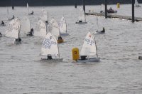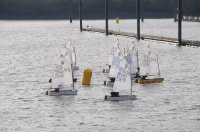 Pünktlich um 12:05 starteten 24 Seglerinnen und Segler zur ersten der beiden 25-minütigen Wettfahrten. Die Besatzungen der beiden Begleitboote - Frank, Rolf, Stefan und Thomas - mussten ob des böigen Windes einige Hilfestellungen leisten.
