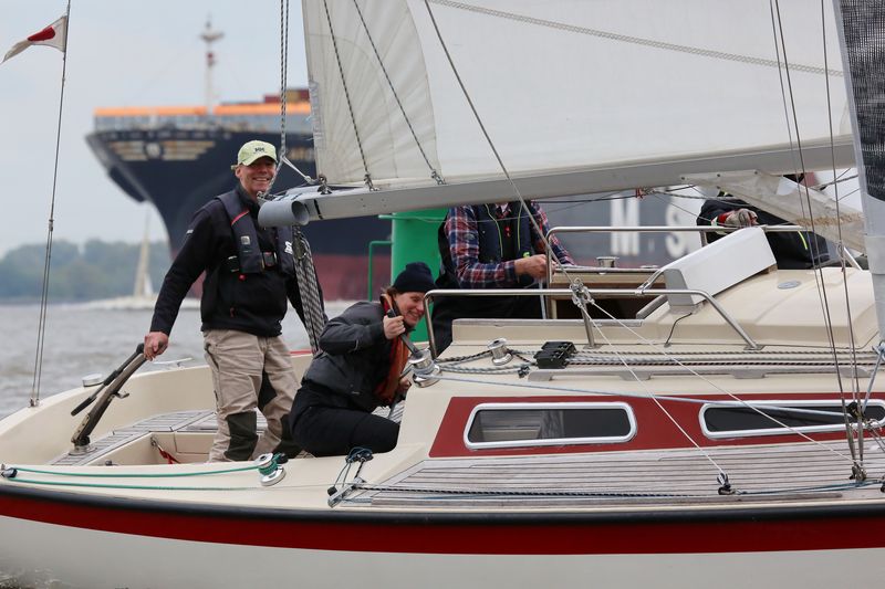 Pünktlich zum Regattastart kommt ein grosses Handelsschiff die Elbe herunter und so gibt es erst einmal eine Startverschiebung um 15 Minuten.